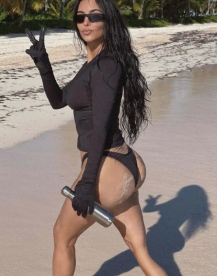 Kim se encontraba disfrutando de unos de días de vacaciones junto a Pete Davison en las Bahamas cuando decidió hacerse varias fotografías en las paradisíacas playas. Entera de negro, con un bikini, una camiseta ceñida y unas gafas de sol, Kim posó ante el objetivo de su novio, pero hubo un detalle que le pasó totalmente desapercibido.