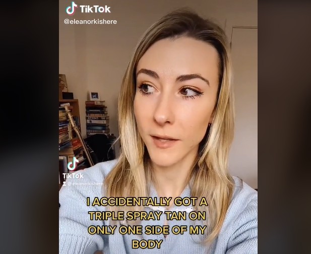 Eleanor decidió que lo mejor para conseguir lo que quería de una forma rápida y barata era irse de cabeza a un centro de bronceado en spray. Una vez en el establecimiento, pidió un «bronceado ligero, de nivel 1», hasta ahí todo normal.